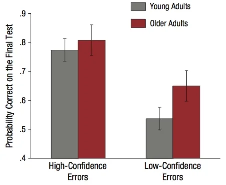 What’s more surprising, however, is how the older adults performed on the retest, after they were given the answers to the questions they got wrong. Although current theory assumes that older adults have a harder time learning new material - their semantic memory has become rigid, or “crystallized” – the scientists found that the older subjects performed much better than younger ones during the second round of questioning. In short, they were far more likely to correct their errors, especially when it came to low-confidence questions: