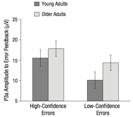 You can see these age-related differences in the EEG data. When older subjects were shown the correct answer in red, they exhibited a much larger P3a amplitude, a signature of brain activity associated with the engagement of attention and the encoding of memory.